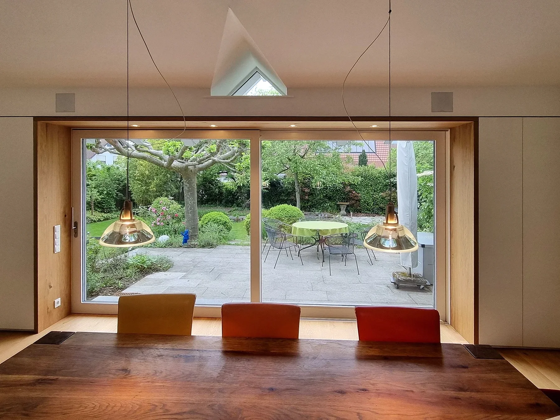 Das Finale: Passt. Erfreut – auch noch nach Jahren – zum Beispiel unsere Bücherwand in Kirschbaum, die gleichzeitig Aufstieg zum Speicher ist und zum Filmegucken die Leinwand herunterfährt. Oder unser “Sankt Tisch” aus Walnuss, den ich im Holzlager aussuchen und dessen Werden ich mitverfolgen konnte. “