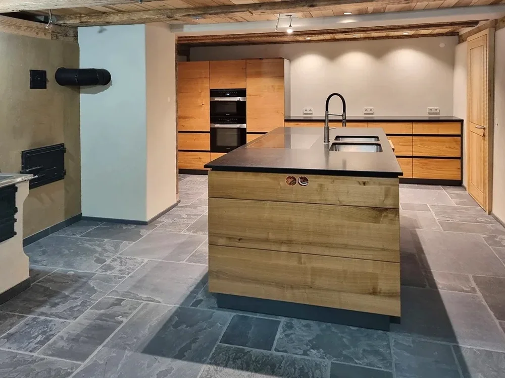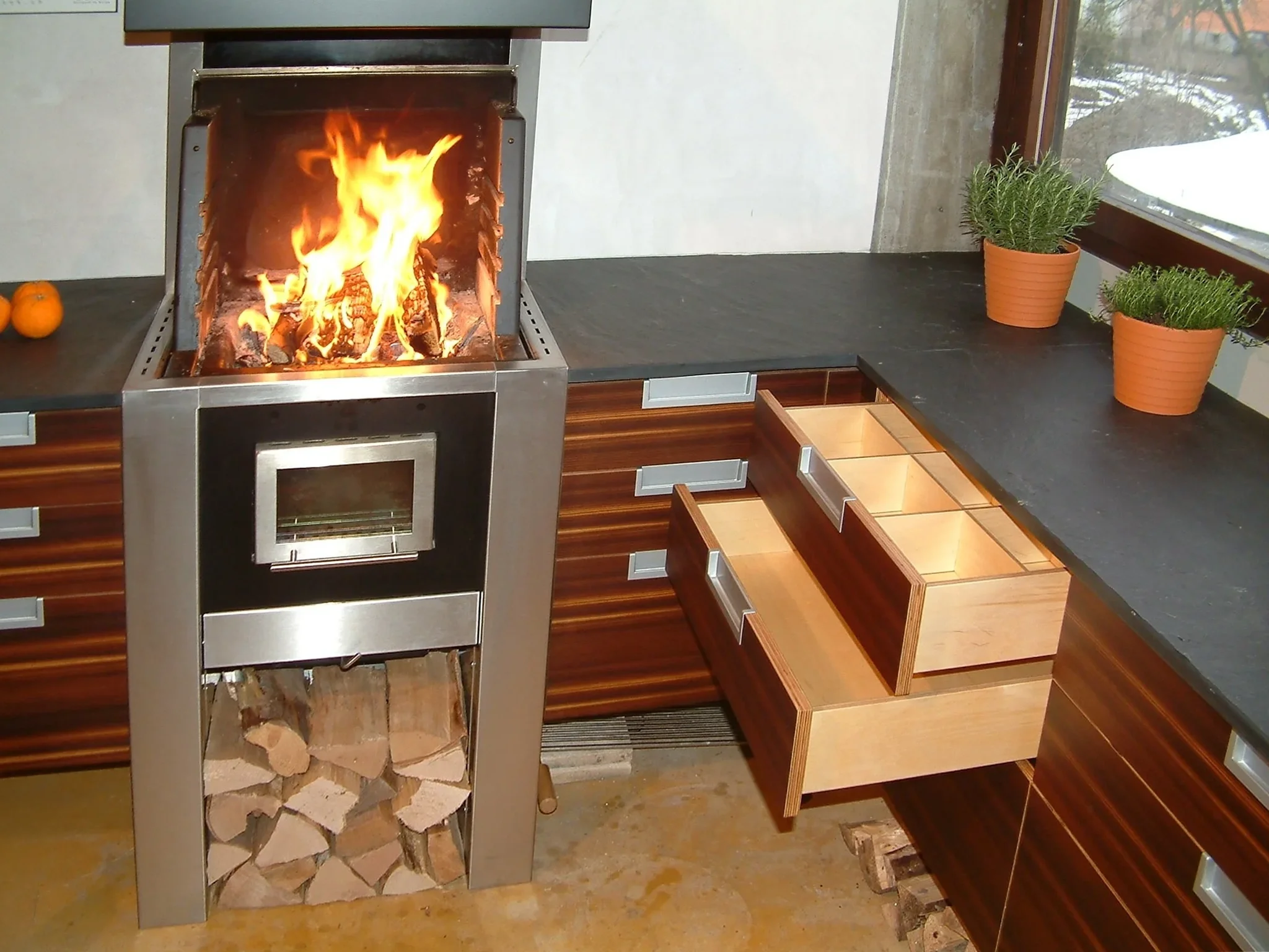 küche aus thermisch behandelter Lärche mit echtem Feuer